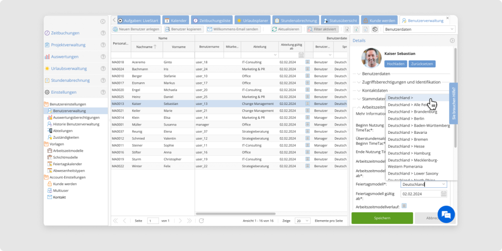 TimeTac stellt für den gesamten EU-Raum und viele weitere Länder einen Feiertagskalender zur Verfügung. Gesetzliche Feiertage, die ausschließlich in einem bestimmten Bundesland oder Kanton gelten, stehen ebenfalls zur Verfügung. Allen Mitarbeitenden kann in der Benutzerverwaltung der passende Feiertagskalender zugewiesen werden. Der Kalender kann auch um nicht gesetzliche Feiertage erweitert werden.
