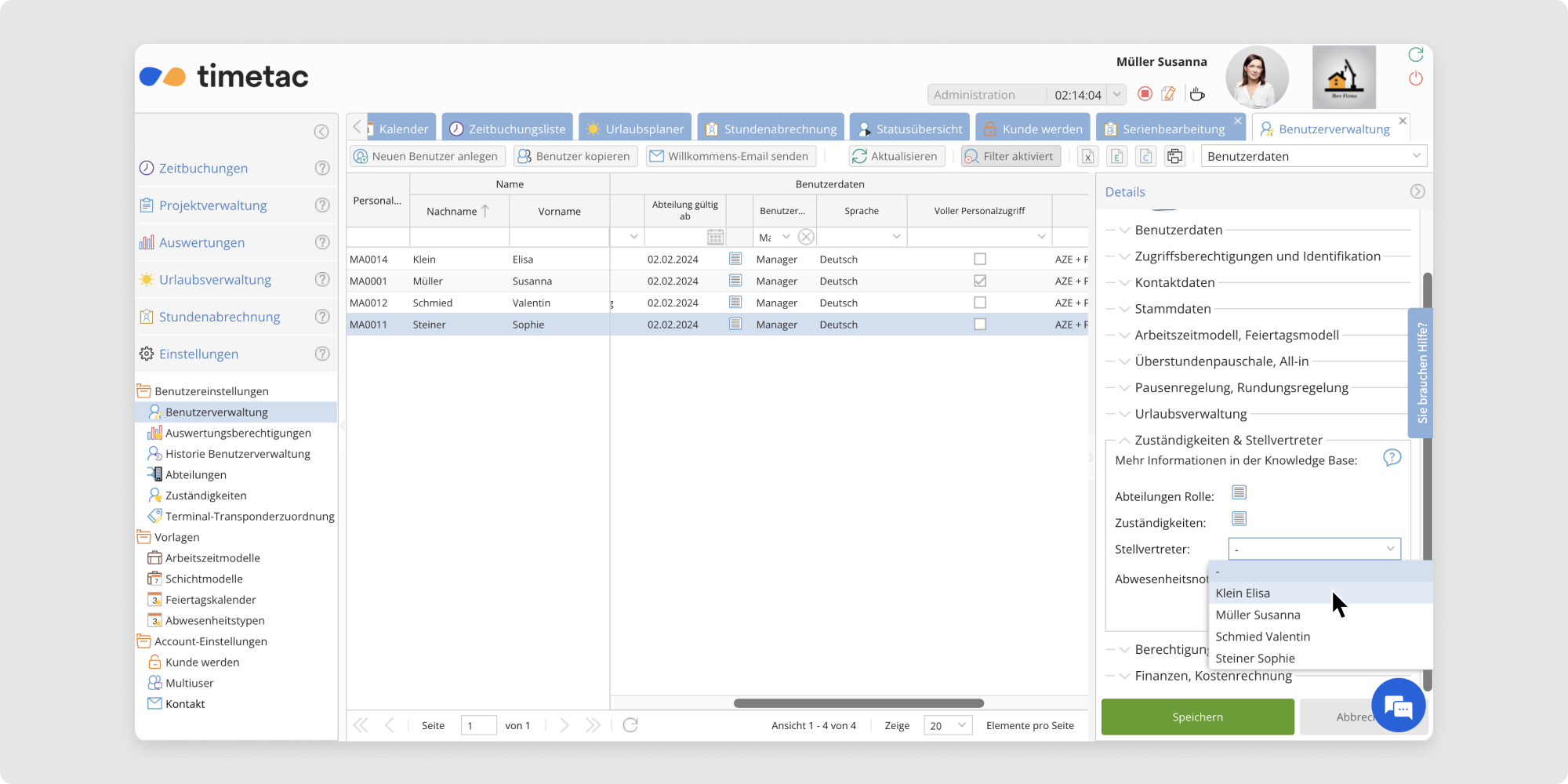 Nur bei Managern, die auch Zuständigkeiten haben, ist das Auswahlfeld bei Stellvertreter aktiviert.