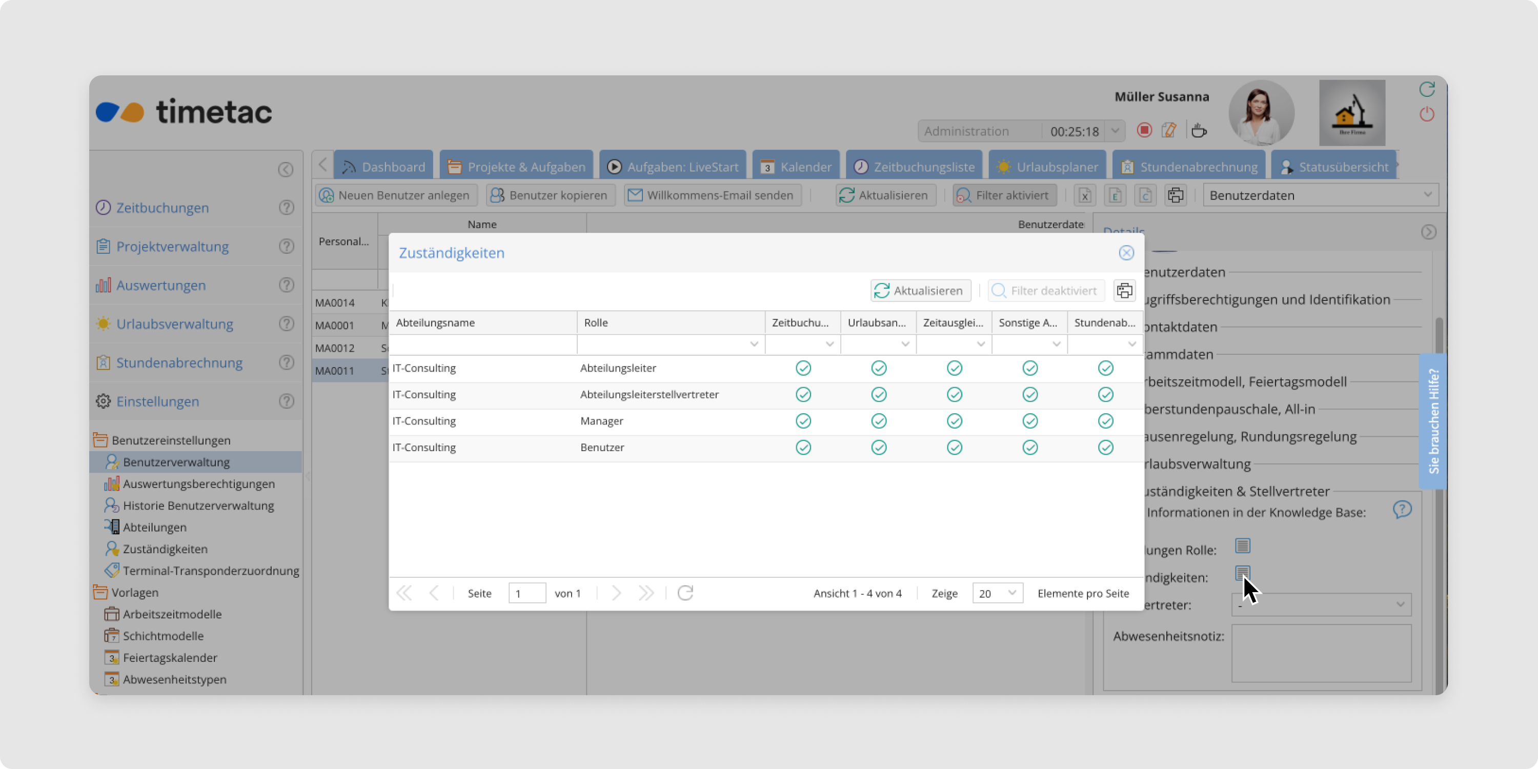 - Im Dialogfenster sehen Sie alle Benutzerrollen und Abteilungen, für die der Manager zuständig ist.