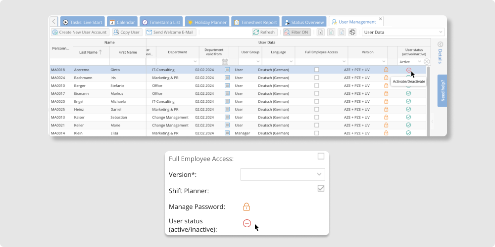 When a user is logged out of their account, they will be informed via email. Additionally, we will notify all account administrators within TimeTac. To allow access, an administrator will need to navigate to User Management, and click on the status symbol next to User Status. You can also manage this on the right in Details and User Data.