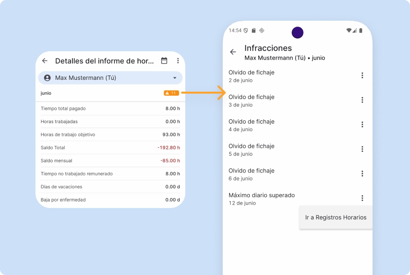 Simplemente toca el icono de advertencia para ver un resumen de todas las incidencias en el informe de horas. Pulsando sobre una incidencia, puedes acceder directamente al registro horario erróneo para corregirlo.