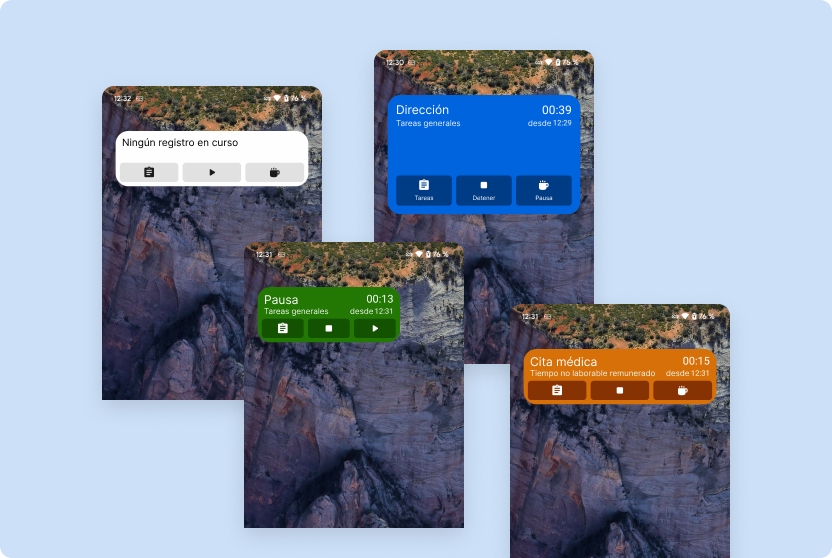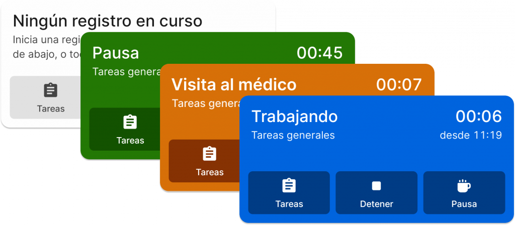 Te presentamos un nuevo diseño para el registro de jornada en la app móvil. Esta actualización ofrece una experiencia más sencilla y una vista clara, manteniendo todas las funcionalidades habituales. Los colores de fondo resaltan el estado de tus registros, para que puedas identificar cada tipo de tarea con un color diferente. ¡Disfruta de esta nueva forma de registrar tus horas!