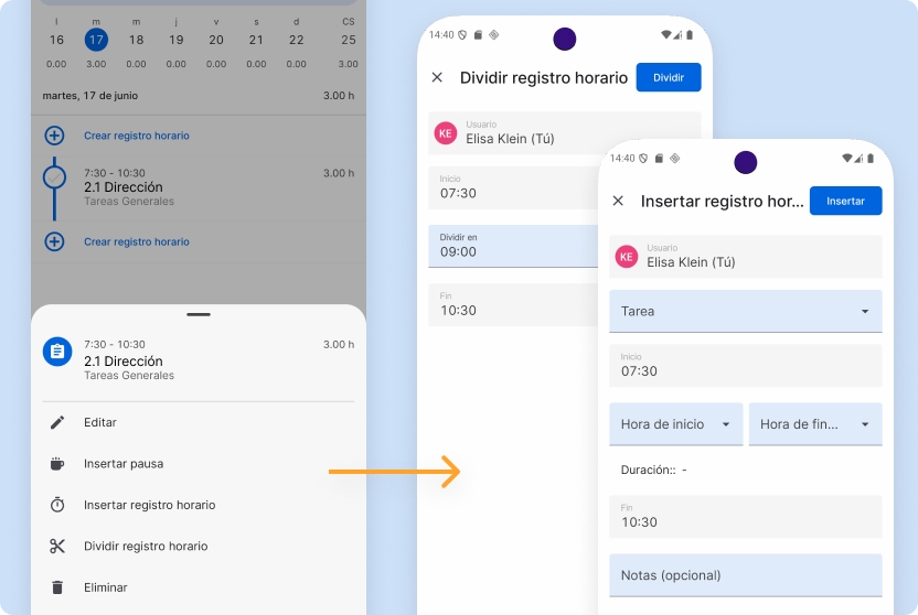 Maximiza tu flexibilidad de registro horario con nuestra práctica función para editar tareas. Divide tareas existentes o inserta nuevas con solo unos toques. Es simple, rápido y mantiene tu flujo de trabajo sin interrupciones—porque tu tiempo debe trabajar para ti, no al revés.