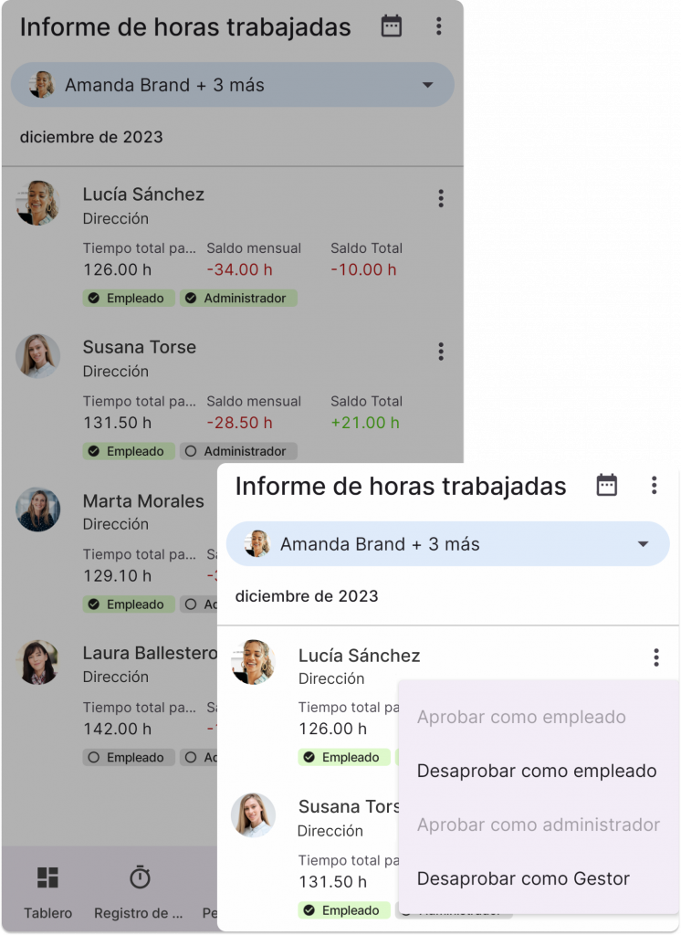 Como administrador o responsable de nóminas, puedes aprobar los informes de horas en la App para tus empleados. Al aprobarlos, confirmas que todos los registros horarios hasta incluido este día de las personas en cuestión son correctos.