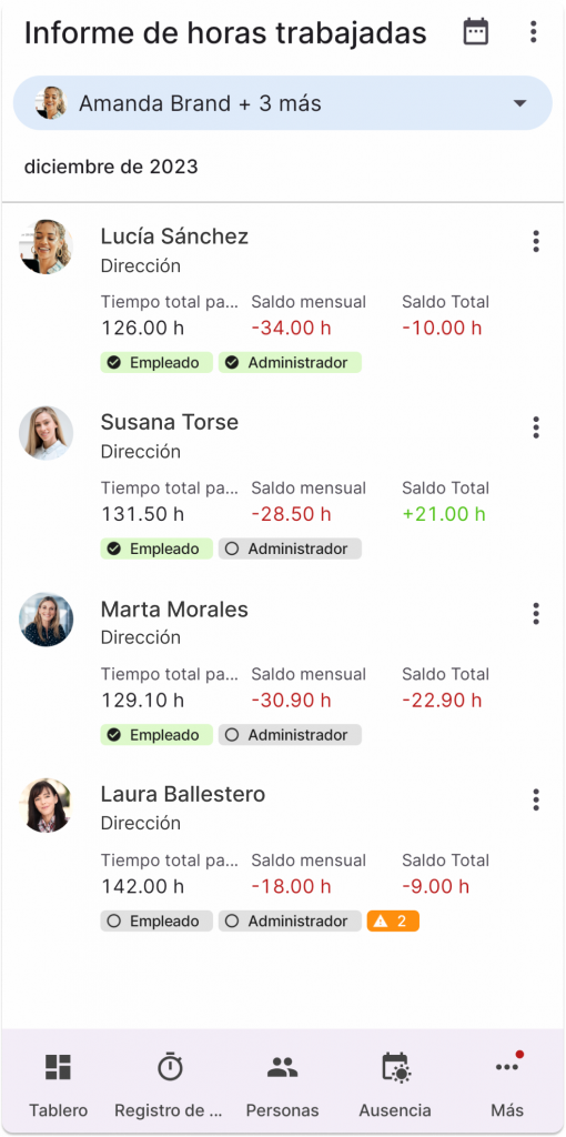 En esta versión, puedes hacer clic en el menú Más y luego en Informe de horas. Esta opción te ofrece un resumen general de tus horas de trabajo y de las de tus empleados.
