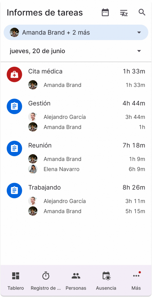 Puedes visualizar diferentes tipos de informes y filtrarlos por empleado, periodo de tiempo o tarea. Esta función ahora también está disponible en la App para los usuarios que NO usen el módulo «Seguimiento de proyectos».