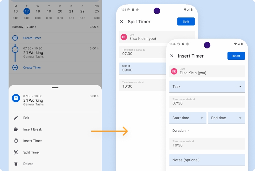 Our enhanced time booking features let you easily split timers or add new ones with just a few taps. Simple, efficient, and built to support a seamless workflow.