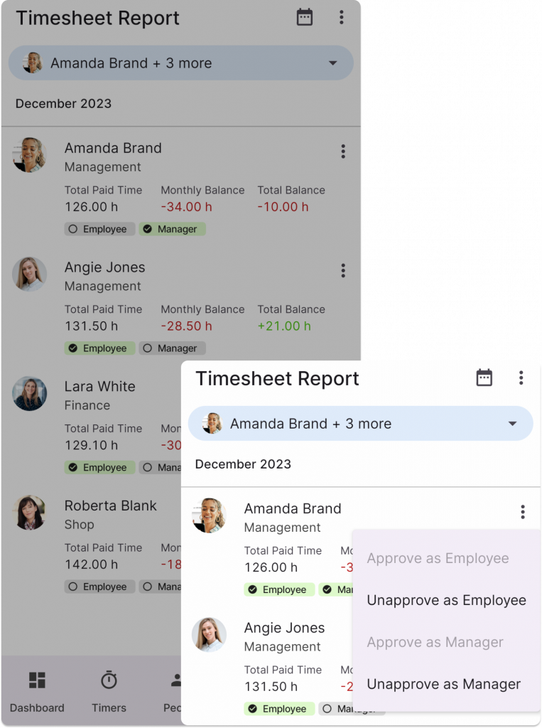 As a manager or payroll accountant, you can approve timesheet reports in the app for others. When you approve them, you confirm that all records of the concerned person up to and including that day are correct.