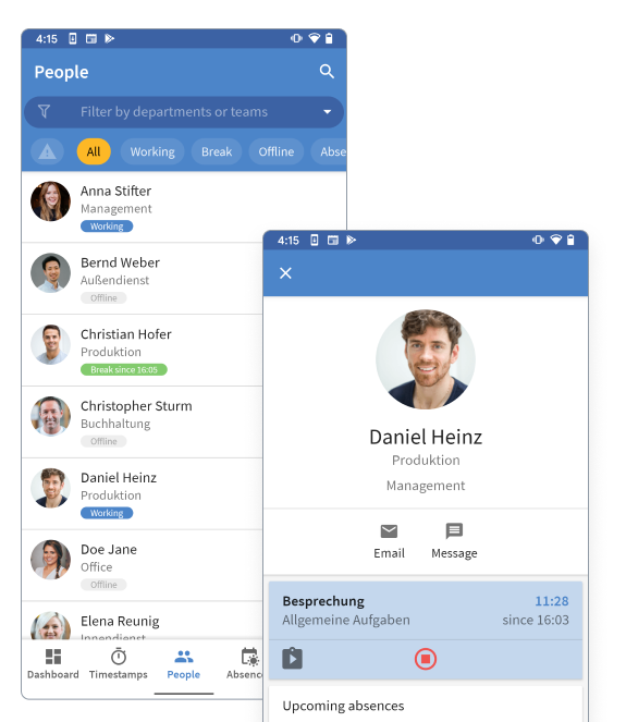 We redesigned the ‘Status Overview’ to make it easier and faster to find out which of your colleagues are working and who is absent. You will find an improved filter to only show people with certain status e.g. people that are currently on break.