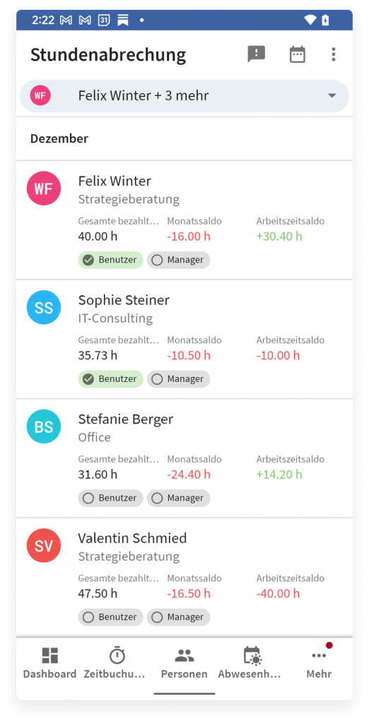 Take a look at your working time over the course of a week, a month or a whole year. The improved view now also differentiates between regular working time and paid absences, like compensatory time.