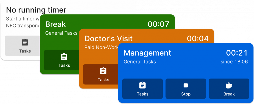 We present a new design for mobile live time tracking. These offer easier handling and a clear overview without restricting the familiar functionality. The bright background colours show the current time recording status at a glance. Happy time tracking!
