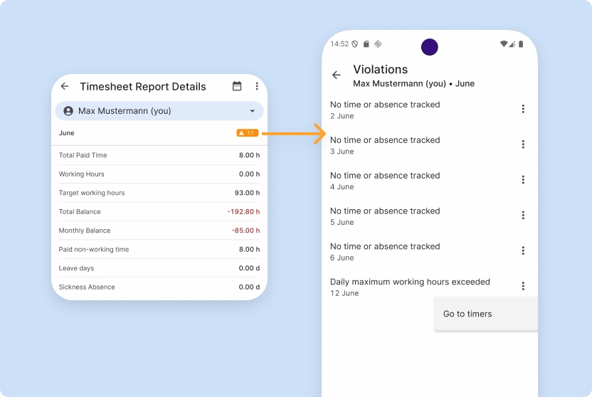 Simply tap on the warning icon to see an overview on all timesheet violations. With another tap on a list item you can navigate directly to the violating entry to correct it.