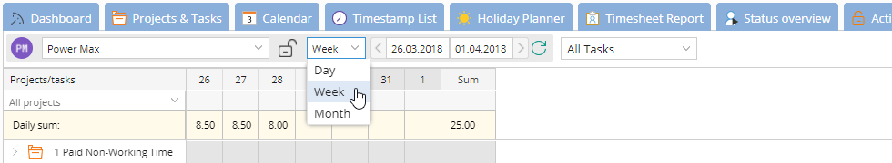 You can subsequently enter time stamps sorted by projects and tasks.