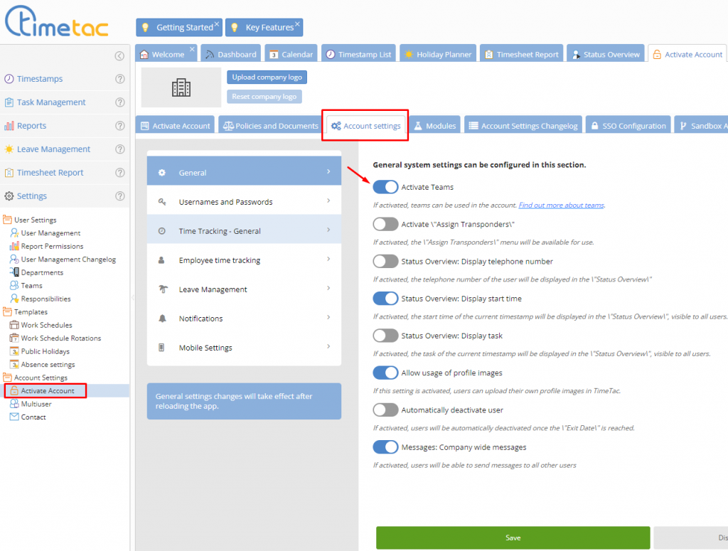 - Once there, click the blue tab Account settings and remain in the section General. The first setting on the right is Activate Teams. Please make sure it is active and save with the green button below.