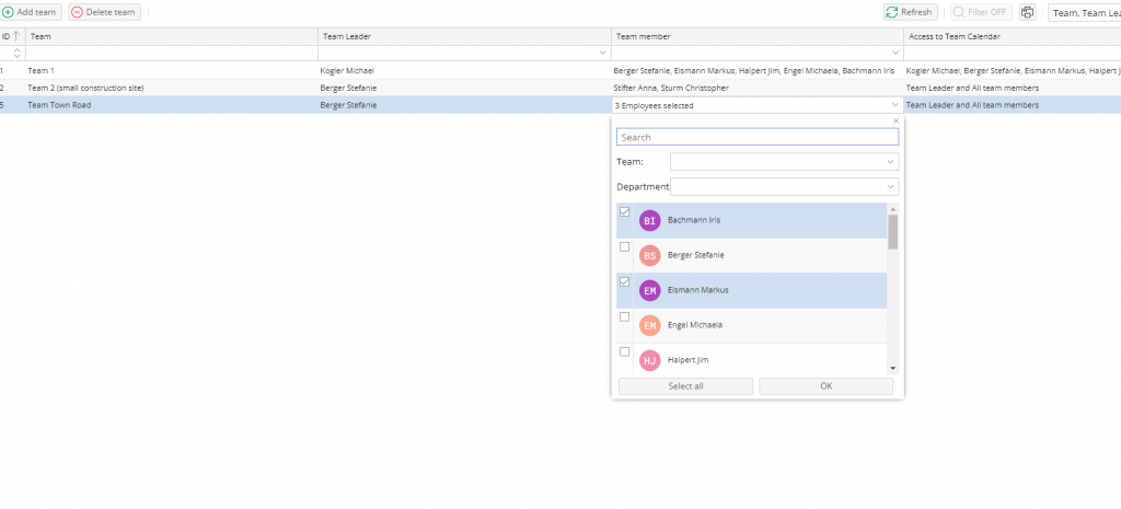 Set a name, team leader, team members and whether or not there should be access to the Team Calendar.