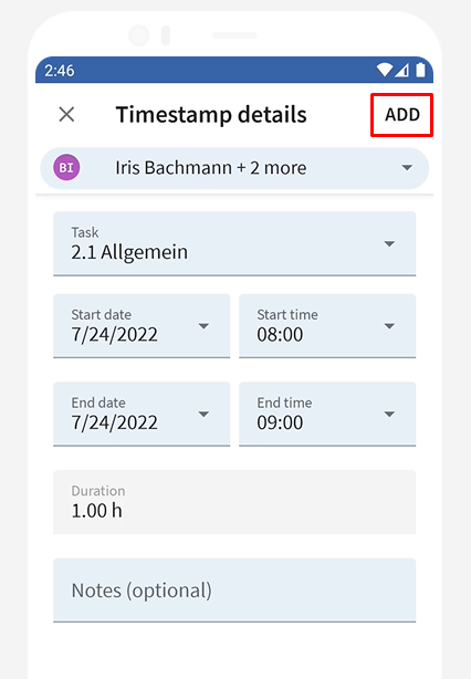 Afterwards, tap the + symbol in the list to add a timestamp for the given time and task. Accept with Add.