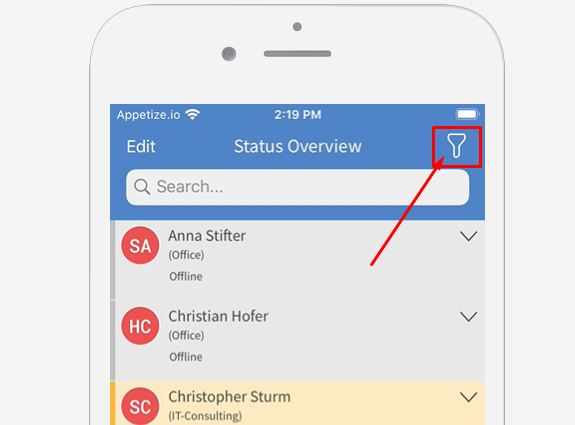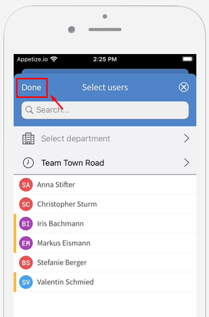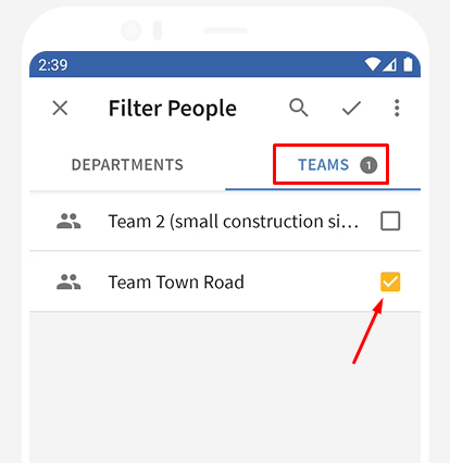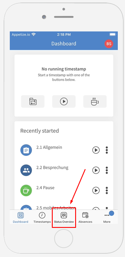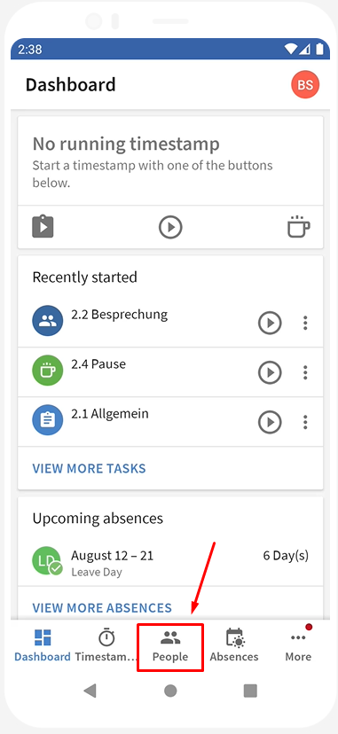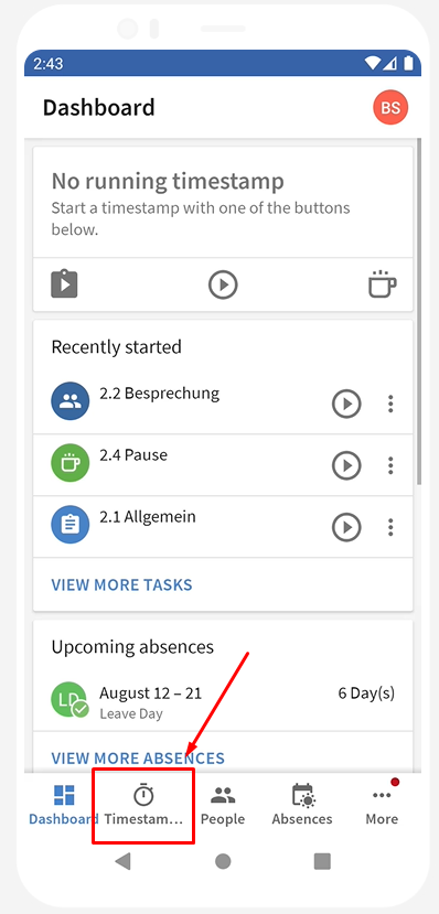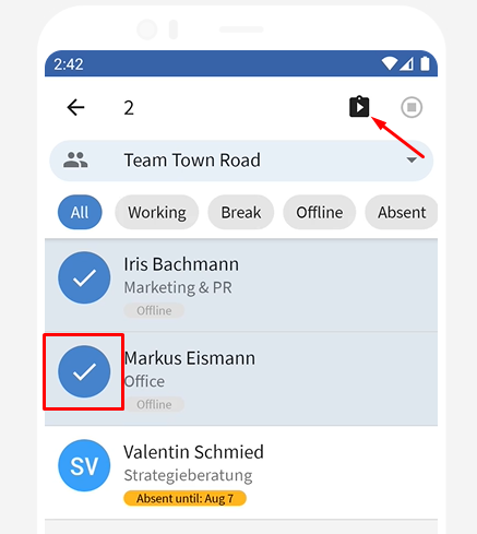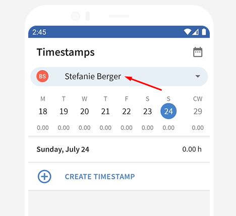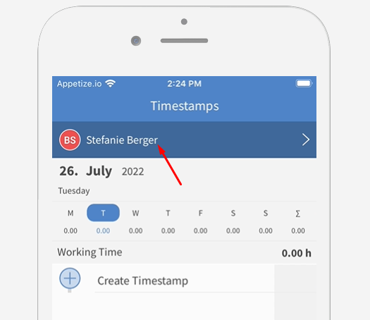 Once there, tap your name and select the team you want to track time for. Accept by tapping the check mark in the top right corner. You can create timestamps via the + symbol in the list.