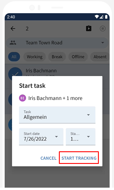 You can select team members from the list by tapping the circle left of their names. The start and stop buttons are on the top right. Select a task and tap Start Tracking.