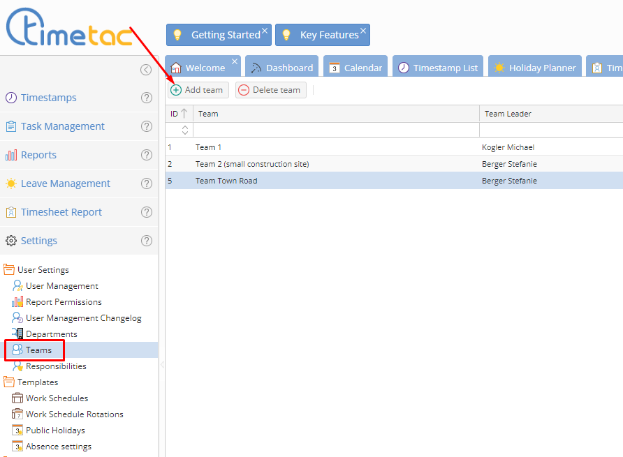 - After all the needed teams have been created, please get in touch with us via info@timetac.com. We will activate the Team Tracking feature for the given teams (free of charge).