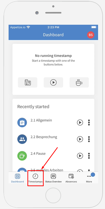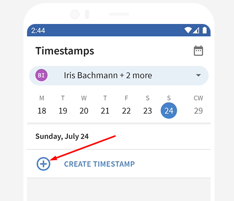 Once there, tap your name and select the team you want to track time for. Accept by tapping the check mark in the top right corner. You can create timestamps via the + symbol in the list.