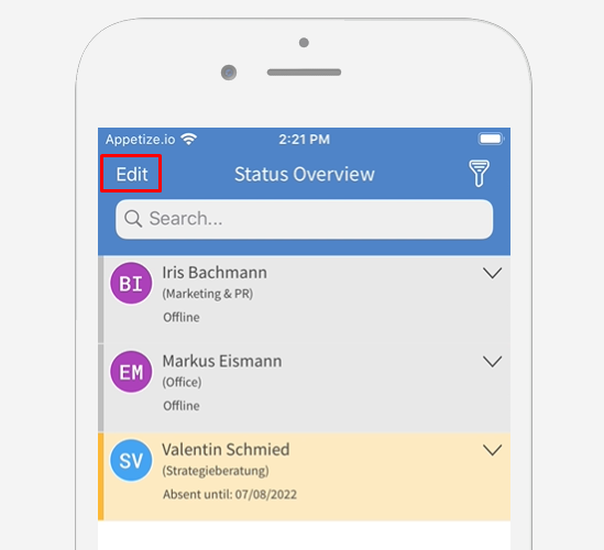 The chosen team is now displayed in the overview. Tap Edit in the top left to pick all or a selection of the team to start a timer for. You can see the start and stop buttons in the top right.