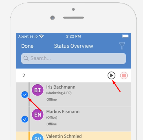 You can select team members from the list by tapping the circle left of their names. The start and stop buttons are on the top right. Select a task and tap Start Tracking.